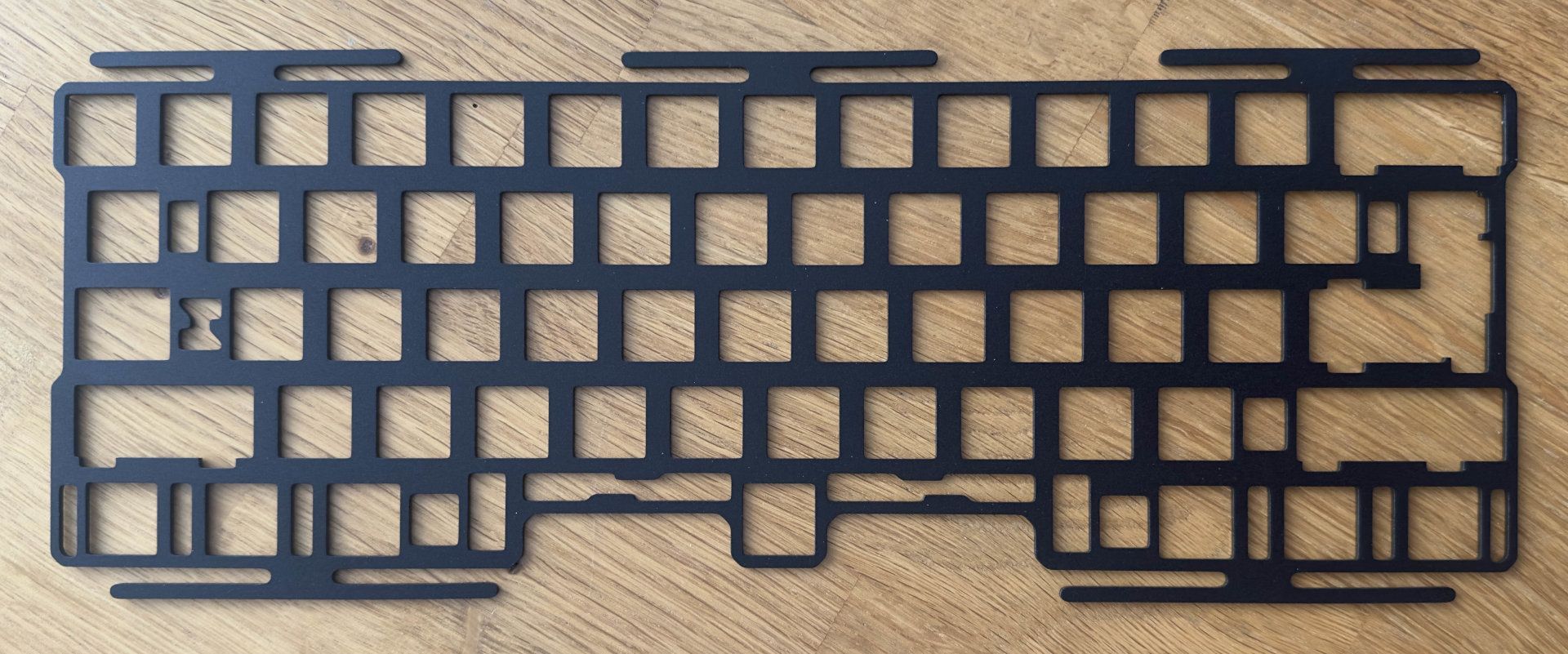 Il plate incluso nel base kit è in alluminio ma sono previsti extras in PC e CF. È possibile scegliere tra una PCB da saldare (con supporto ISO completo) o una hotswap (ma solo ANSI). In entrambi i casi la bottom row è solo e soltanto Tsangan.